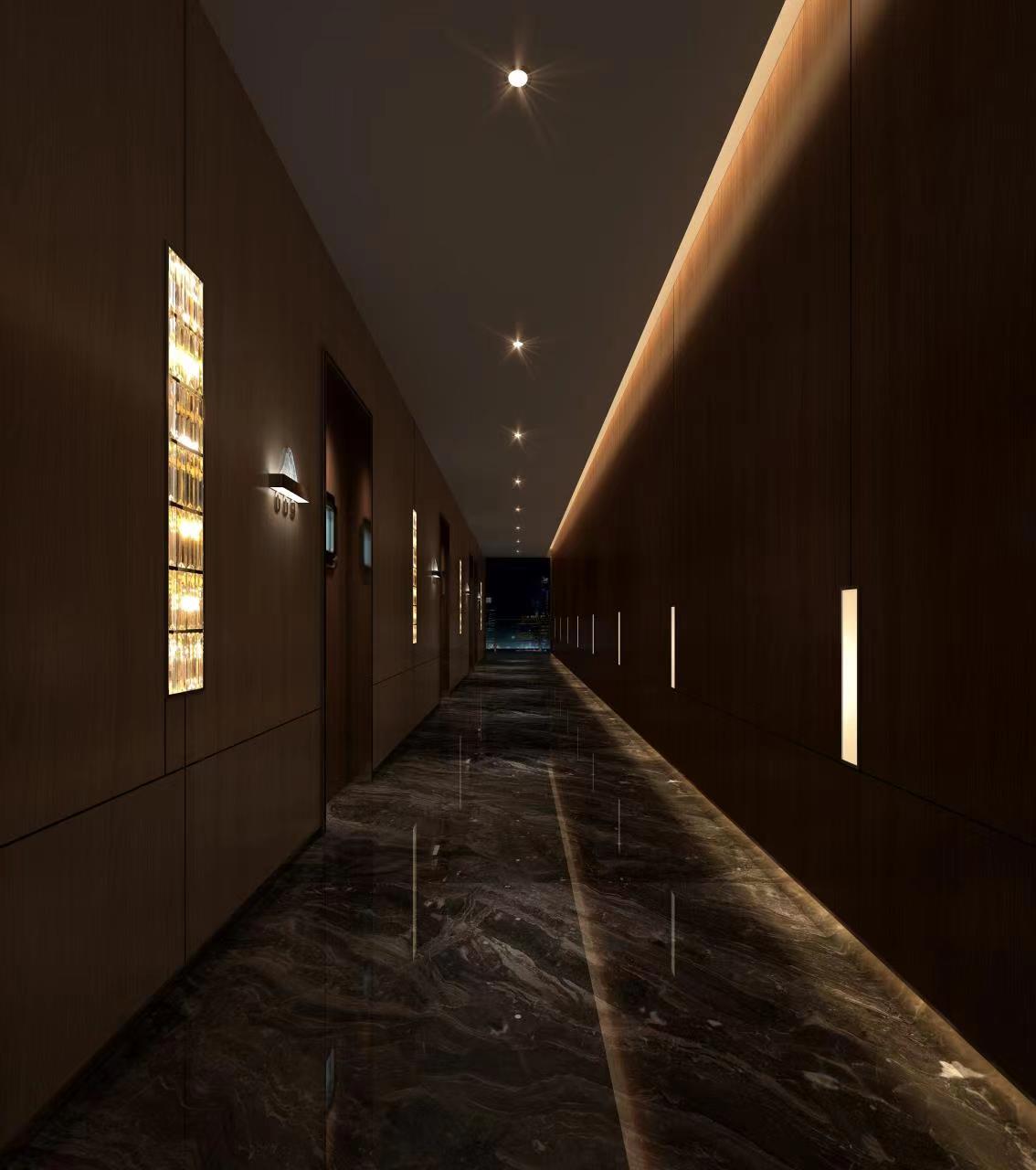 兩側木質裝飾的平整墻面、純粹的白色吊頂、光滑的大理石地面,三者佐以柔和的暖黃燈光,將一整條修長的走道塑造成曲徑通幽的景象,同時襯托出餐吧簡潔大氣、不落俗套的氣質。
