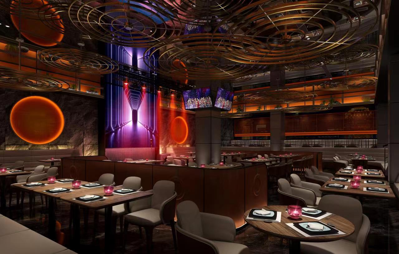 設計師精妙的利用落在大廳之中的承重柱為起點,整齊有序的劃分出內中外三個區域,同時三個區域之間用半身高的建材做了半包分隔,這樣既使得三個區域之間有了物理間隔,又可以讓三個區域共享整個大廳的視野,得到感官上的開闊感。另外,設計師在該承重柱上布置四塊屏幕,將其一下子提升為整個大廳的聚焦點,讓周圍有序排列的桌椅有了眾星拱月的設計感,進而將原本突兀的承重柱徹底化作大廳設計的一部分。四周墻面采用立體浮雕磚面,配合園林景觀中特有的圓形窗臺、溫暖微醺的橘黃燈效,讓消費者全方面感受到寧靜平和之感。不僅于此,設計師還在桌面上放置了玫紅色的亮色燈盞,燈盞發出的亮色光暈和周遭相對昏暗的橘黃色光線對比形成一個專屬于消費者自身的空間,這種利用燈光光效差在面積有限的大廳來營造空間隔斷的設計,著實不凡。而其頂上錯落布置的銅色類蚊香圓吊飾和如云似水的晶瑩刻像,則進一步融入了中式設計的特色元素,提升了大廳的整體設計韻味。而作為餐吧主體之一的吧臺,設計師則采用了大片透明玻璃作為和其他區域的間隔,然后以密集的暖黃燈效作為烘托,將吧臺清晰明了地呈現在消費者的視野中。