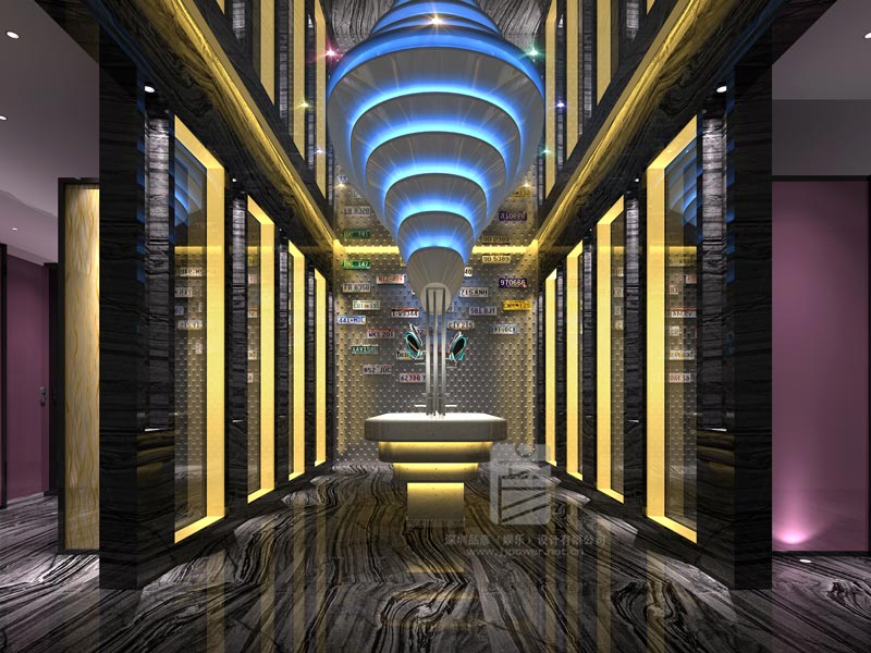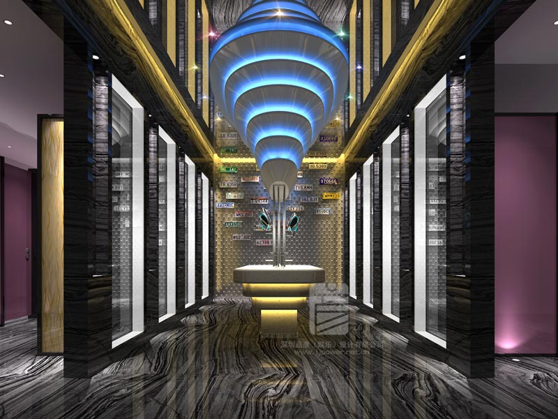 踱步進入內部空間,沖入眼簾的時尚元素,令人震撼。室內吊頂設計恍如隔世,好像進入更深邃的海洋世界。吊頂采用輕骨架設計,流線型的曲線設計,似層層波浪像遠處散去。在這波浪之中,點綴的銀魚造型,若隱若現,在燈光的映襯下,更顯自由自在??臻g中間部位的幾個柱子,似定海神針,又如參天大樹,撐起整個空間的骨架。頂部支撐位置,將突兀的柱帽打造出別樣的色彩,用LED燈不斷變換色彩,像即將降落的宇宙飛碟,迎接來自外太空的神秘來客;換個角度,又如自帶發光體的水母,與銀魚裝飾交相輝映。