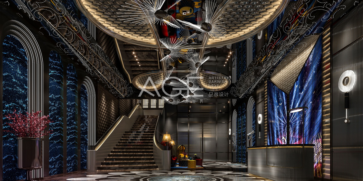 商務KTV二樓大廳一,整體空間設計個性十足,延續完整性的搭配風格又凸顯出自己獨有的魅力,讓新中式風格的設計無處不在,天花板的圓與墻體的方,讓整體涌現出不規則的美,一面墻壁特色的大蓮花圖案,襯托出一種優雅的氣息,色彩搭配帶出富麗堂皇的氣場,再用燈光映襯又更顯得大氣華貴。商務KTV.二樓大廳二,整體空間設計創意感十足,矩形與線條元素的運用增添立體效果,天花板與一面墻采用一體的設計效果,用燈影進行不同的光源區分,并帶出時代感和特殊的意境,給人以富貴之氣。