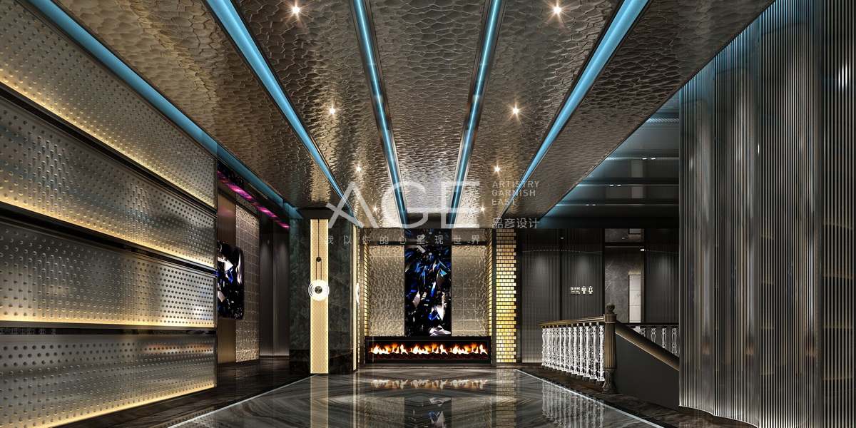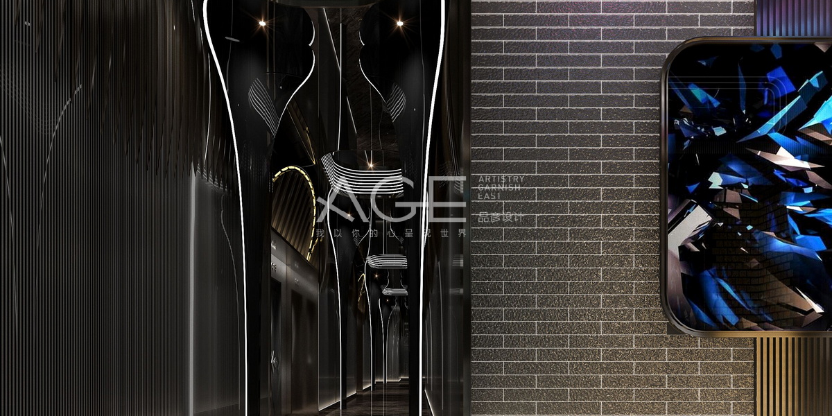 商務KTV走廊一,色彩搭配盡顯華貴之氣,一眼望去,一道亮麗的風景線。整體色調柔和,更顯瑰麗迷人,凸顯金屬材質帶出來的精致與細膩。燈光和色調巧妙搭配,突出追求的音樂效果和動感的視覺效果。商務KTV走廊二,以暗色基點為主,盡顯神秘又不失立體感,色彩與光影的設計,凸顯細節的雕琢,加入創造性解構人文素材,更讓讓藝術性與功能性有了高度的統一。