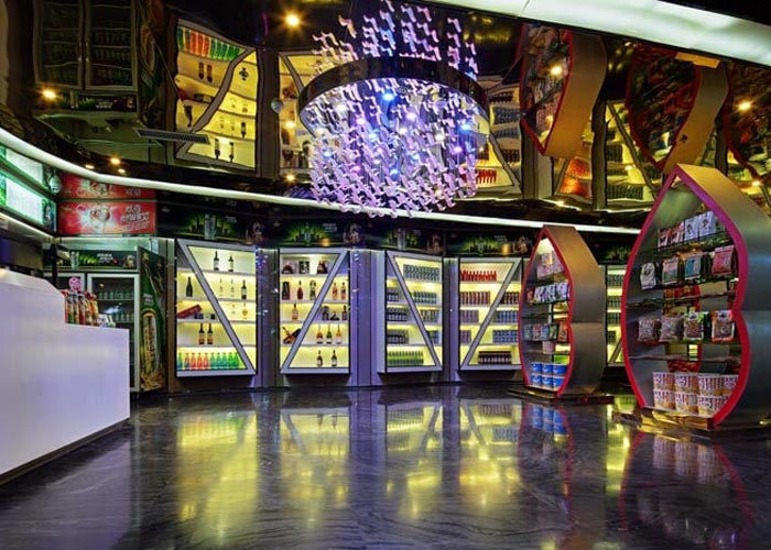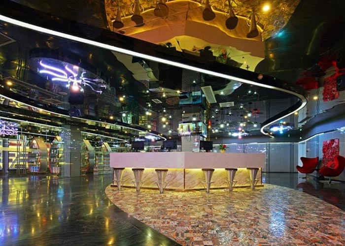 水果硬糖般造型圓滑嬌俏的寶石藍、神秘黑、高貴紅、雅潔白樹脂沙發與檸檬黃、薄荷綠軟式折疊座椅悄然成了糖果屋的???,水波浪紋的弧線天花造型,花瓣形狀吊燈,層次分明,投射地面的彩色光源,使得地面呈現既迷幻浪漫又具現代時尚簡約感的甜蜜風情。