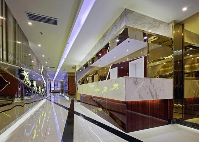 整個大廳如同清涼的潤喉薄荷糖,清爽怡人。采用藍、白等冷光源,漩渦紋亞光面大理石地板更富質感,就連文字與店招都感染了夢幻萌系糖果的甜蜜味道,