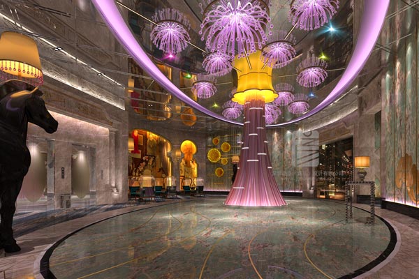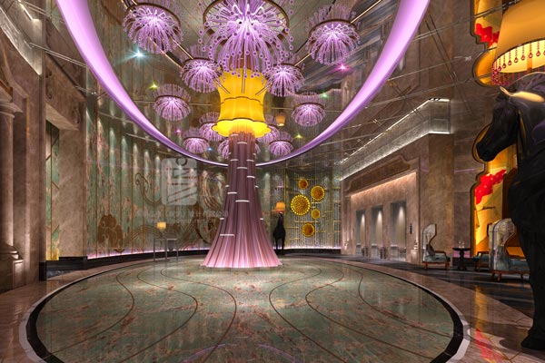 象征“高升”與“如意”的“祥云”、蘊意吉祥的“荷花”等裝飾元素與剛硬的玻璃鏡面材質混搭卻毫無違和感,傾流如柱的水浪波濤、擊打的浪花、水晶雨簾、