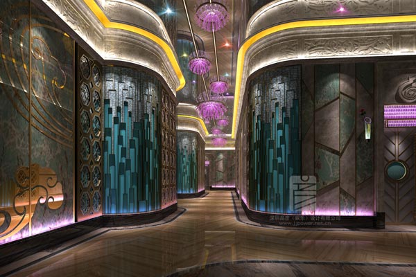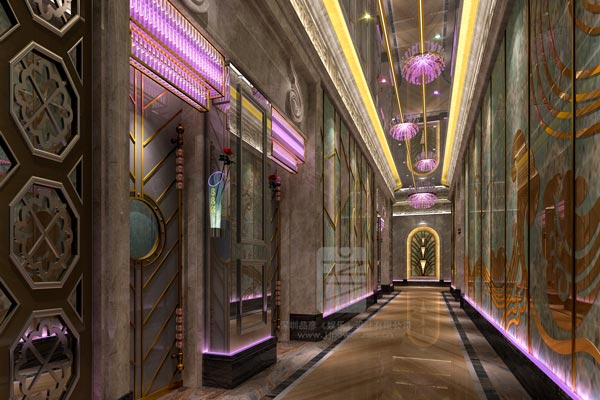 墻面隱約可見的竹葉,朦朧詩意;用極簡的弧線造型勾勒的皇家龍椅線條透露出設計師的“小心機“,摒棄了繁復的家居裝飾,節約成本又能呼應空間;山水書畫、寶藍冰裂釉墻面與青花瓷臺燈相互呼應,優雅大方;粉色帷幔下的唐代侍女圖,簡化線條的歐式古典絲絨沙發與極富時尚現代感的光影緊密相連,走道內中式窗欞呈對稱式排列,設計師特別打造的別具匠心的“女神玫瑰花”悄悄綻放在每個包房的門架花框內,增強了空間人群的互娛性與承載關聯性,為雅致空間提供別樣的娛樂化細節。
