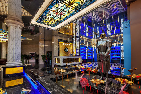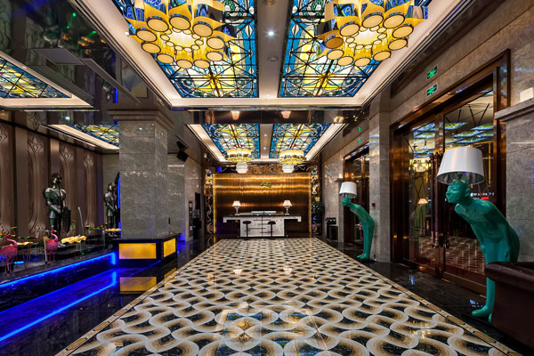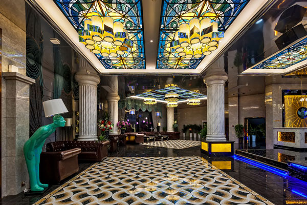 進入本案的大堂空間,豪華而不浮躁,更能夠感受到細節上的尊貴氣質,精致而有品位。大堂的裝修設計中,利用鏡面材料作為墻面裝飾,鑲嵌金屬勾花的鐵藝元素,使墻壁與隔斷虛實結合,增加了空間的通透性,讓大堂的整體設計充滿了層次感。地板沒有按部就班的鋪貼,而是根據石材的圖案拼湊出波狀花紋,交錯成魚鱗狀圖案。吊頂選用幾何鏤空圖案的輕質隔板,搭配西式水晶吊燈,墻角邊柱上裝點西式浮雕設計,將中西元素完美融合,在鏡面材料的映襯效果下,營造出萬花筒的感覺,不同角度有著截然不同的視覺體驗。