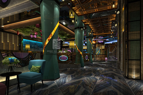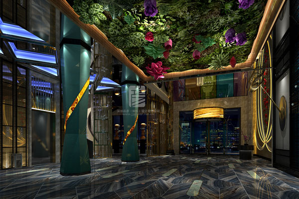 本案的外觀設計簡潔大方,重點突出。屋頂及門廳上方分別設置“三人空間”logo,并傳達“娛樂目的地”的理念,讓人一目了然,門廳上方采用對稱的翅膀元素來點綴,通過不同的燈光變化,層次分明,奪人眼球。進入大堂空間,重點突出了別致典雅、浪漫輕奢的設計特點,并融合了官渡文化的傳統符號,將空間打造的美輪美奐。吊頂采用傳統木質穹頂的設計理念,通過木質龍骨的裝飾手法,增加空間的層次感,大堂中心區域的吊頂更是別出心裁的點綴了大面積的鮮花綠植,與燈光設計融為一體,成為空間的點睛之筆。中心立柱貫穿三層的立柱,采用官渡文化中代表的“烏銅走銀”的設計創意,大膽的采用綠色為底色,用金色鏤空曲線裝飾,將柱子裝點成為金鑲玉的玉簪,成為空間中不可少亮點。