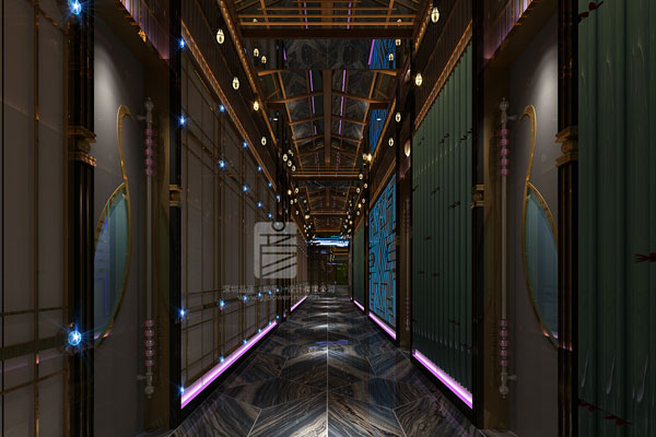包房是本案設計的靈魂,每個包房不同的風格是本案設計的重點也是亮點。根據功能定位,包房營造了不同的娛樂氛圍,二層包房主打甜蜜浪漫風格,主要采用粉色等暖色調的色彩搭配,墻壁設計采用了不同的線條,并暗埋LED燈帶,配合音樂變換出不同的燈光,打造了一個輕松甜蜜的氛圍。三層包房更顯性感魅惑,大量采用的藍色系的設計,將整個空間襯托的輕奢別致,尤其吊頂更是把色彩和燈光設計做到了極致,層次分明的水晶吊燈,盡顯奢華??偨y房更是將別致典雅做到了極致,墻壁采用了充滿立體感的設計,大面積的龍骨吊頂也營造出大氣磅礴的感覺,并根據龍骨的線條走向設置了大量的燈帶,點綴的小射燈如一顆顆閃耀晶瑩的鉆石,似夜空中閃亮的星,給空間增加了更多的亮點,打造出良好的聲光環境,給消費者更好的視聽感官和更好的娛樂享受。
