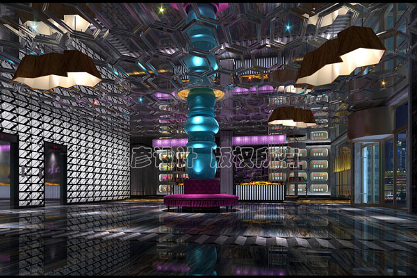 進入本案的大堂空間,能夠感受到國際范帶來的巨大震撼。大堂空間充分利用了層高的優勢,運用國際先進的設計理念和表達手法,將國際潮流設計元素有效融合,帶來了全新的視覺體驗。大堂墻壁采用鏡面材料裝飾,堆疊排列,組合出如同一大片顯示屏的效果,彰顯國際范。吊頂采用輕質吊板材料,吊板上六邊形的幾何圖案排列組合,呈現出蜂巢般的規律,提升了吊頂的設計感。吊燈選用充滿時尚感的立體結構的吊頂,如一盞盞迎風上升的孔明燈,韻味十足。對于大堂空間中的承重柱,設計中巧妙的揚長避短,圍繞柱子設置卡座,將柱子進行再次創造,霸氣典雅的柱子設計與吊頂融為一體,猶如定海神針直沖云霄。