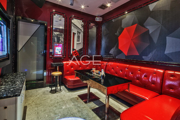 藍色包房則設置成為花的海洋,典雅的地中海藍充斥在整個房間內,大面積的透窗讓空間擁有更廣闊的通透感,藏藍色卡座依次排開盡顯典雅氣派,吊頂線條自由流暢,并以花朵進行裝點,靜謐悠遠,見證呼朋喚友的愉悅時光。紅色主題包房則呈現出濃濃的酷炫氣質,酒紅色的真皮卡座霸氣十足,墻壁黑色背景下的紅色雨傘,奪人眼球,表達著不羈的張揚個性。