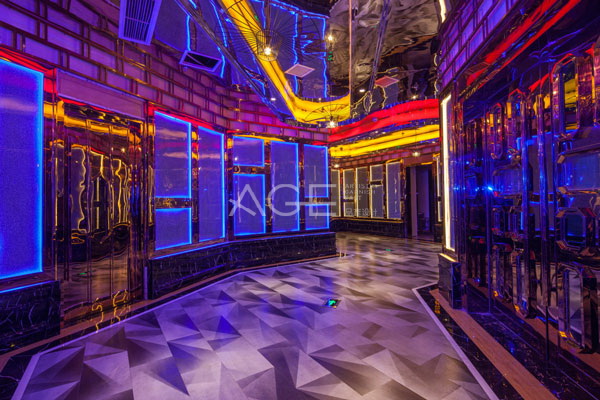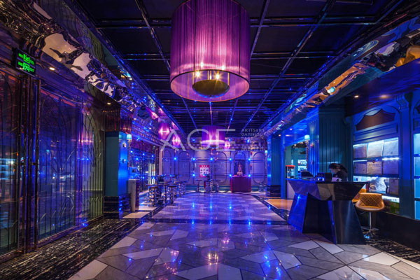 進入KTV內部,能感受到撲面而來的酷炫潮流氣質,盡顯設計師時尚混搭的設計魅力。大堂的設計中充分利用了空間的結構,因地制宜的采用了金屬桁架、垂吊大燈、玻面材料等設計元素,并通過線條造型的變化及燈光效果的映襯,凸顯高質感的同時,讓大堂空間更為生動。地面采用板材拼接的方式,將不同色度的板材鑲貼出不規則的幾何圖案,明暗結合,自然隨意。墻壁上端以規則的金屬線條裝飾,與吊頂四周的玻面材料裝飾自然過渡,墻面以白玻打底,將金屬隔條設置為圓環形,埋設筒燈,仿若夜空中閃爍的星,讓整個空間增加了靜謐的神秘色彩。吊頂采用金屬桁架設計,周邊環繞玻面材料,時尚硬朗,簡約大氣,懸掛圓柱形垂吊大燈,金屬框架配以紫色紗幔,為空間增添一抹柔情。