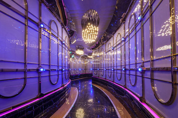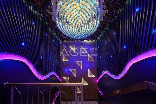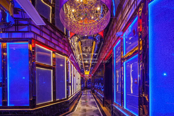 走廊空間作為連接各個空間的紐帶,也是展示設計理念的重要環節,楊彥設計師通過創意十足的設計,將走廊空間打造成為時光隧道,別具韻味。連接大堂空間的走廊,與大堂設計一脈相承,地面以深色板材鋪裝,鑲嵌淺色邊框,墻壁以金屬隔條作為裝飾,仿若一個個時光膠囊,隨時可以通往神秘的世界。二樓走廊更多的是凸顯酷炫的設計氛圍,地面明暗組砌,墻面以茶色玻璃鑲邊,暗埋LED氛圍燈帶,吊頂設置造型多變的燈具,燈光變幻中仿若進入萬花筒的世界,打造美輪美奐的氛圍。樓梯空間的設計更是別具匠心,線條和燈具的設置營造出神秘感,水晶大吊燈仿若王冠上耀眼的寶石,成為空間的點睛之筆。