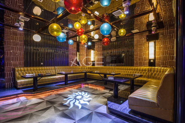包房設計中,楊彥設計師根據功能定位打造出不同風采的包房。紅色卡座的包房采用黑白組砌的地面,尊貴典雅的金屬隔條,大氣優雅的紅色真皮卡座,凸顯優雅氣質。黃色卡座包房則自帶甜蜜氣息,地面明暗結合,吊頂采用玻面材料,搭配炫彩的燈具,仿若漂浮的氣球,營造出幸福甜蜜的氛圍。