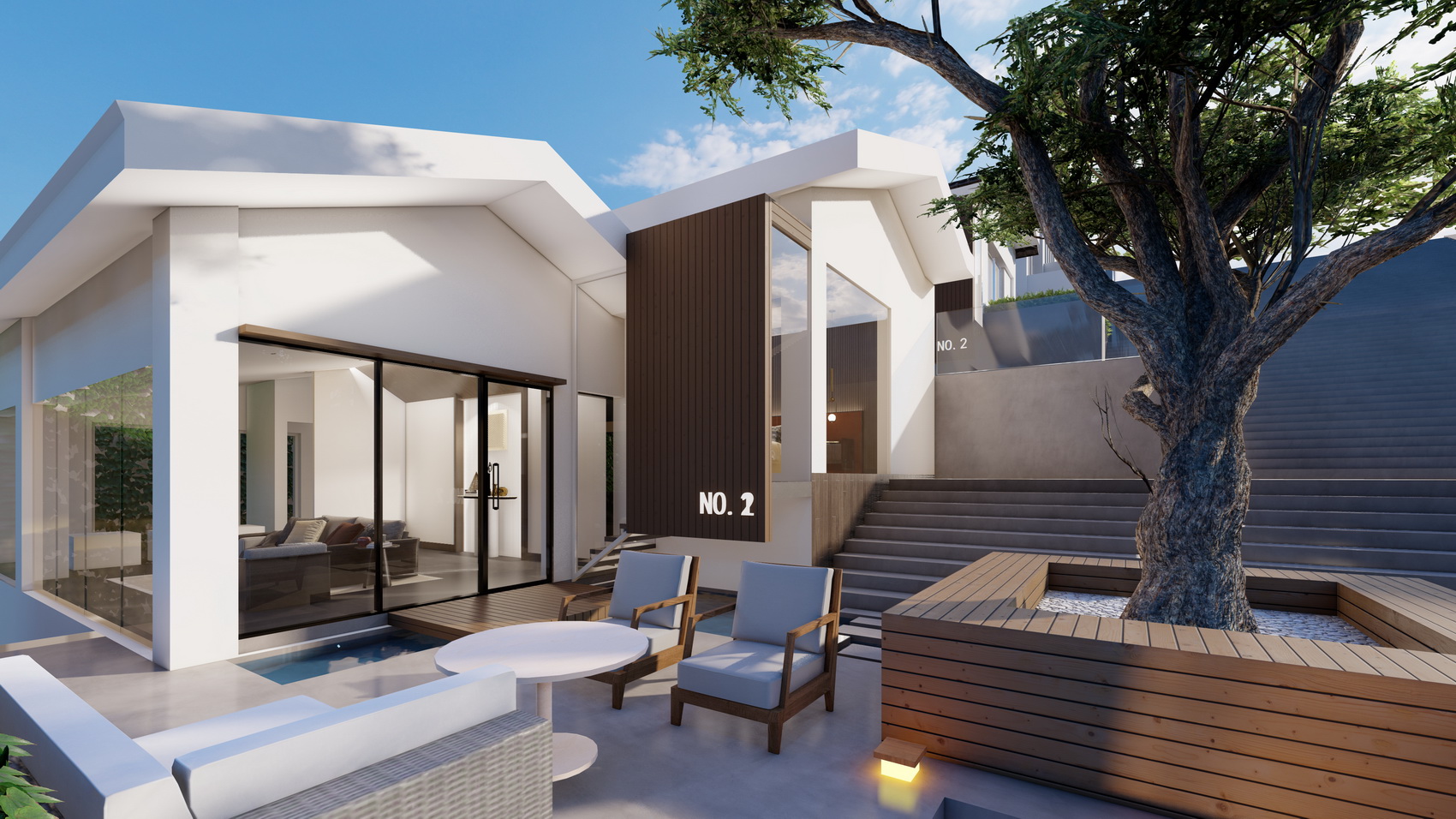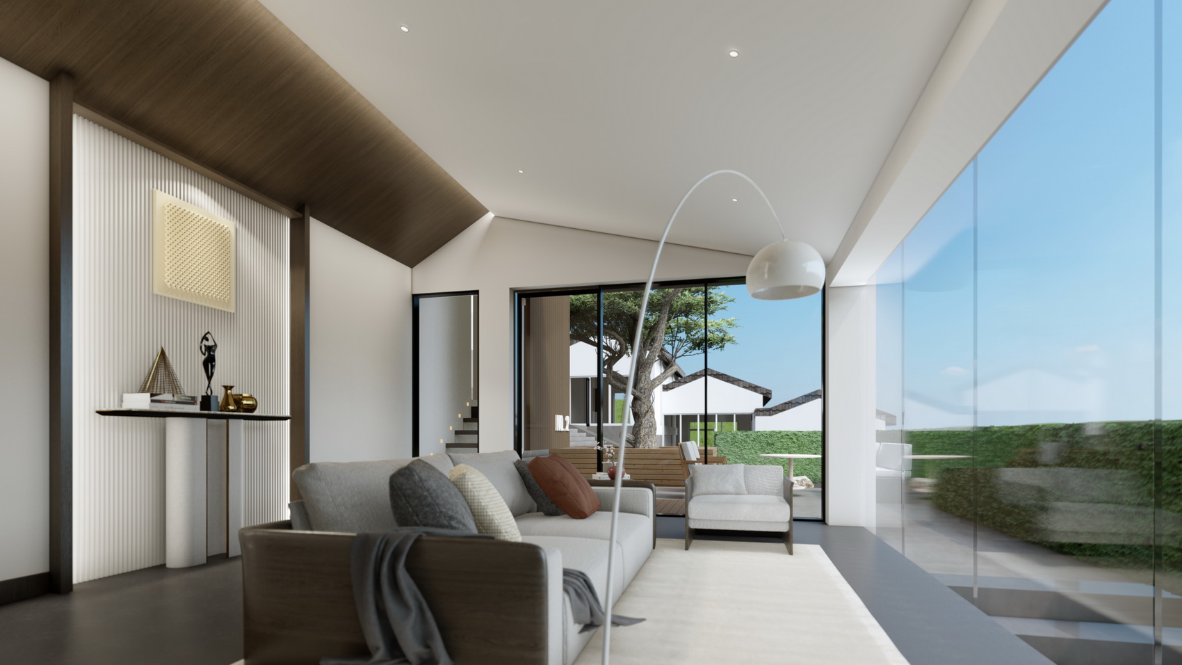 別墅外圍主體建筑設計以現代極簡風格為主,運用大面積平整純白建材,干凈利落體現簡約簡單。屋體墻面采用多面落地窗設計,在保持極簡風格的同時,以透明通透感彰顯現代氣息。屋頂設計以中式傳統坡屋頂為原型,為整體簡約的設計風格增添一抹古老韻味。