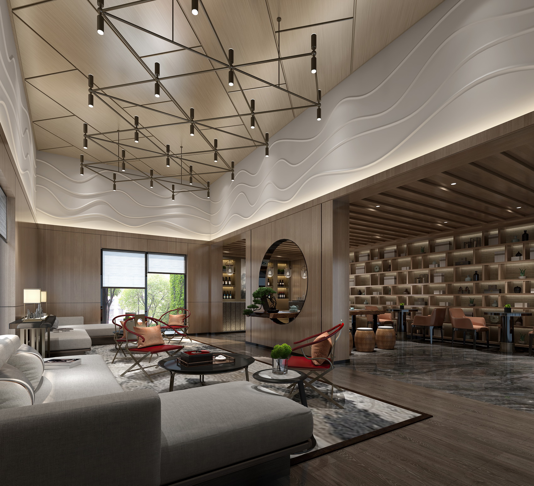 休閑區設計融入傳統與現代,以極簡風格設計的吊頂、燈飾、墻壁、展架等,一同體現了咖啡廳的寬整大氣。在此基礎上,為實現休閑區功能分區,設計師在兩片區域中間采用半隔斷式方案,這樣既在感官上隔斷兩個區域,又因為沒有實際上的物理完全隔斷,變相提高了兩片區域的空間面積觀感。其中圓形鏤空的半隔斷板中央,有一角桌角承載著一株遒然勁松打破空間界限。