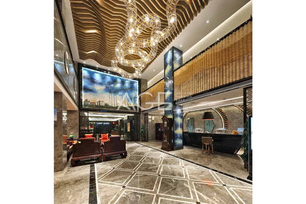 吊頂采用波紋型龍骨設計,依次排開的龍骨造型多變、氣勢恢宏,與一二層的連廊鑲嵌的立體造型完美映襯,墻壁裝飾中采用昆明羽毛畫的文化元素,色彩自然,美觀大方。連接上下層的承重柱采用金屬包邊的全包裹設計,內置氛圍燈,如一根根擎天而起的定海神針,與吊頂共同構建出大堂空間的立體骨架。吊燈堪稱大堂設計中的點睛之筆,盤旋交錯的燈具就像火把節慶典中必不可少的火龍,活靈活現,栩栩如生。