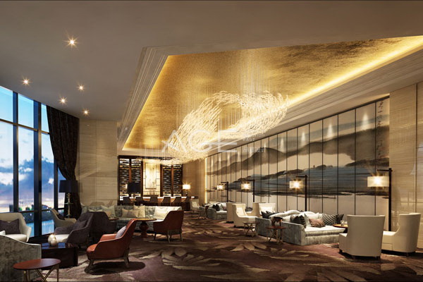 酒店建筑總面積為2萬平方米,高達百米,外觀氣勢恢宏,內飾尊貴典雅,楊彥設計師從色彩搭配到空間劃分都以五星級的標準來設計,功能劃分合理,硬件設施齊全,布置細致入微,堪稱城市新地標建筑。酒店大廳設計是本案的精髓所在,楊彥設計師運用大理石板材、茶色鏡面、金屬隔條等材料,將線條、鏤空、國畫等元素巧妙搭配,墻面則用大幅裝飾畫進行點綴,懸掛的水晶吊燈造型別具一格,亦剛亦柔,凸顯格調之美。尤其大廳正面高墻上的手繪國畫,高5.33米,寬8.13米,是被譽為“江南才子”的江西著名畫家汪天行現場親手繪制,手法豪放舒展,畫面氣勢恢宏,是江西現存尺寸最大的國畫,堪稱酒店的鎮店之寶,讓大廳空間熠熠生輝。
