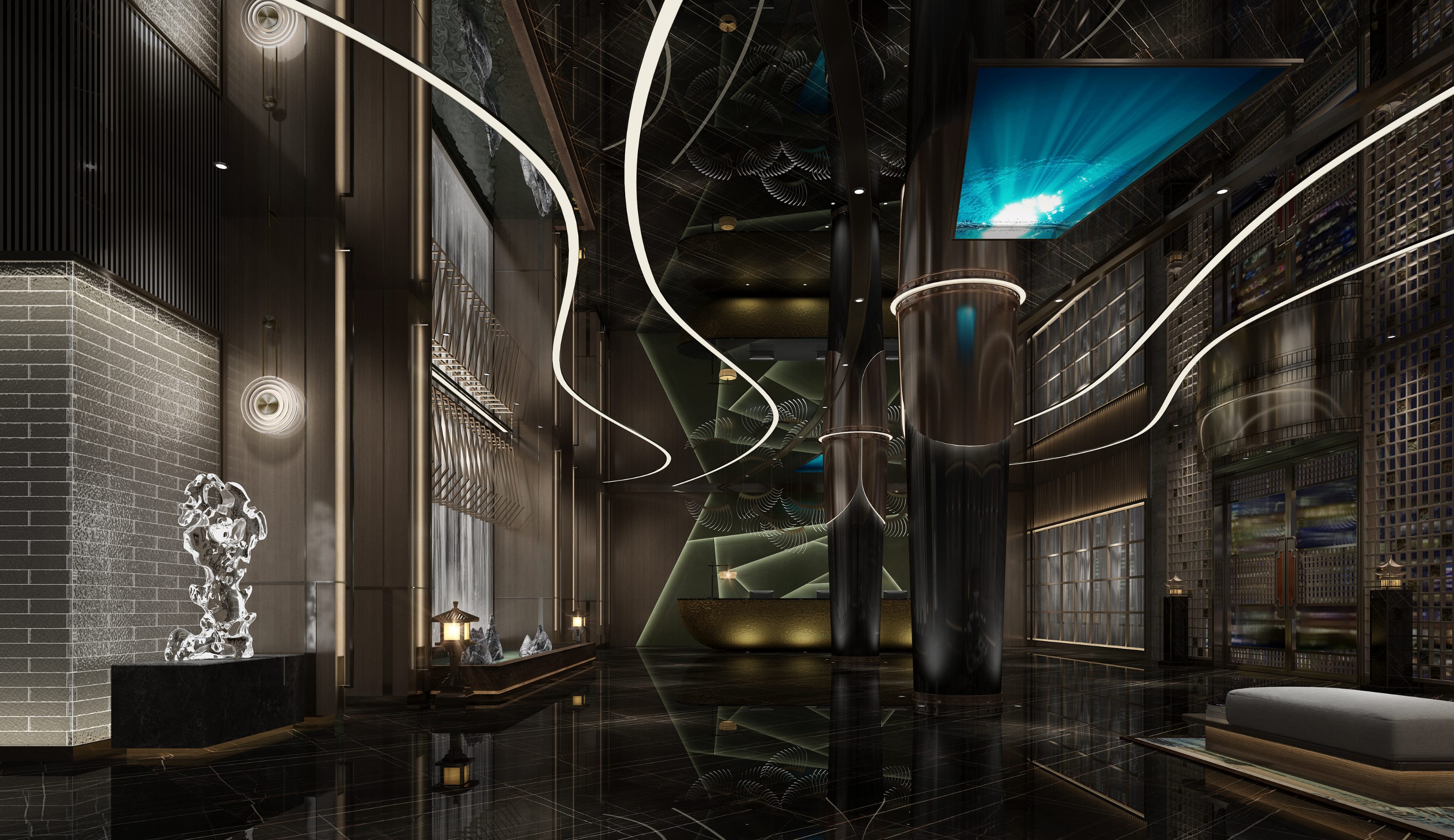 一樓大堂在吊頂設計上,設計師采用如流云般的白色縹緲燈條書寫自由肆意的狀態氛圍,用簡化的抽象花草燈飾和古韻宮燈、淡綠燈光墻點出接待臺所在。兩根如支撐浩大宮殿的碩大圓柱搭配上如鏡面光滑的整片吊頂,大大拔高了一樓大堂層高,給人以震撼之感。在直面消費者的主體設計上,設計師采用了高山流水的世外之境,用大片垂落的白色燈幕勾勒九天銀河瀑布,其下佐以假山小境、古韻宮燈散發的暖黃燈光,共同塑造一幅遺世獨立的寧靜景象。一旁如水流沖溢凝固而成的動態透明雕像擺件更添一抹歲月靜緩的心安。整個大堂設計就好像是將一幅二維的山水畫幅緩緩展開,重新打亂排列逐漸凝成一處三維的山水淡雅世界。