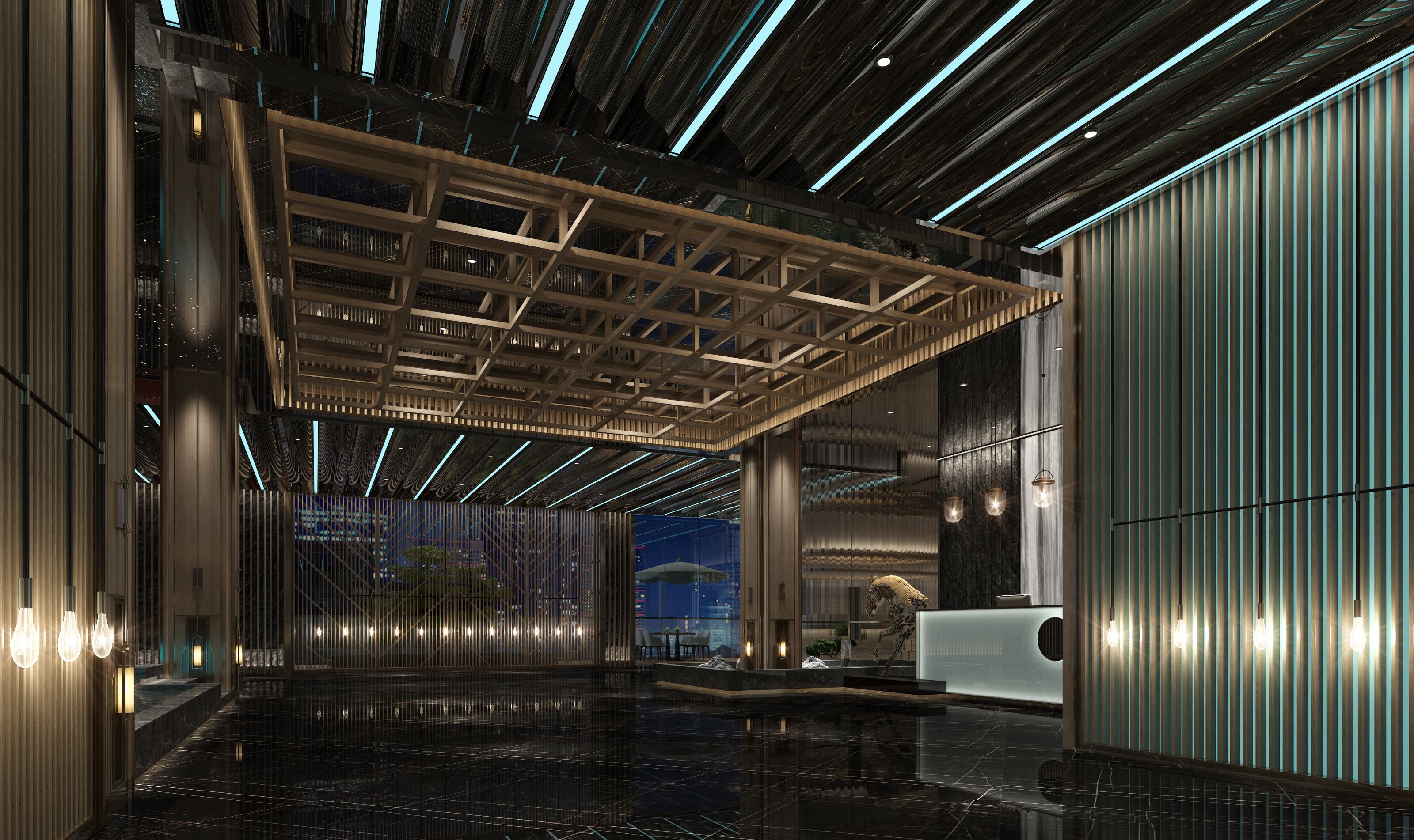 走道設計依舊延續中式淡雅的高貴之氣,大開大合的簡約設計排布自有中式建筑的大氣典雅,兩側墻面放置的蒼綠勁松盆栽打破了平面空間限制,為整條走道的設計增添了幾分活力與亮色。走道吊頂設計,設計師以算盤為設計理念,讓算珠燈光在錯落排序間一如跨越時間空間的璀璨流光,鏈接古今時空。