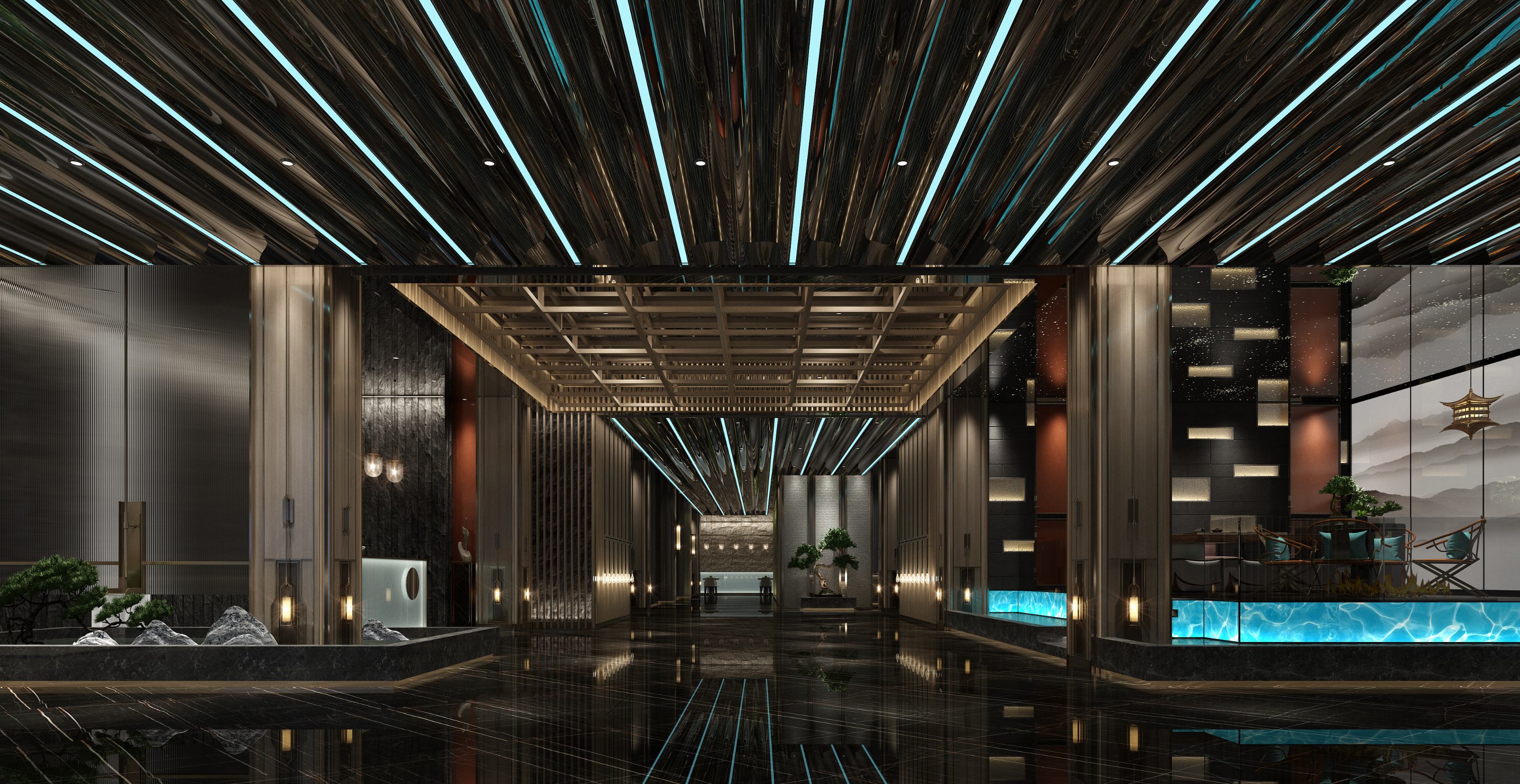 二樓公共空間,設計師在吊頂和墻面的設計上大量采用木質建材,用木質建材的交錯縱橫勾勒出獨具中式韻味的方井套疊藻井、斗拱、格扇門,配合上極具東方審美的遒勁蒼松、神異山石、潺潺水流,讓整個二樓公共空間就如同是一座大型的水榭庭院,蘊藏中式淡雅高貴之氣。