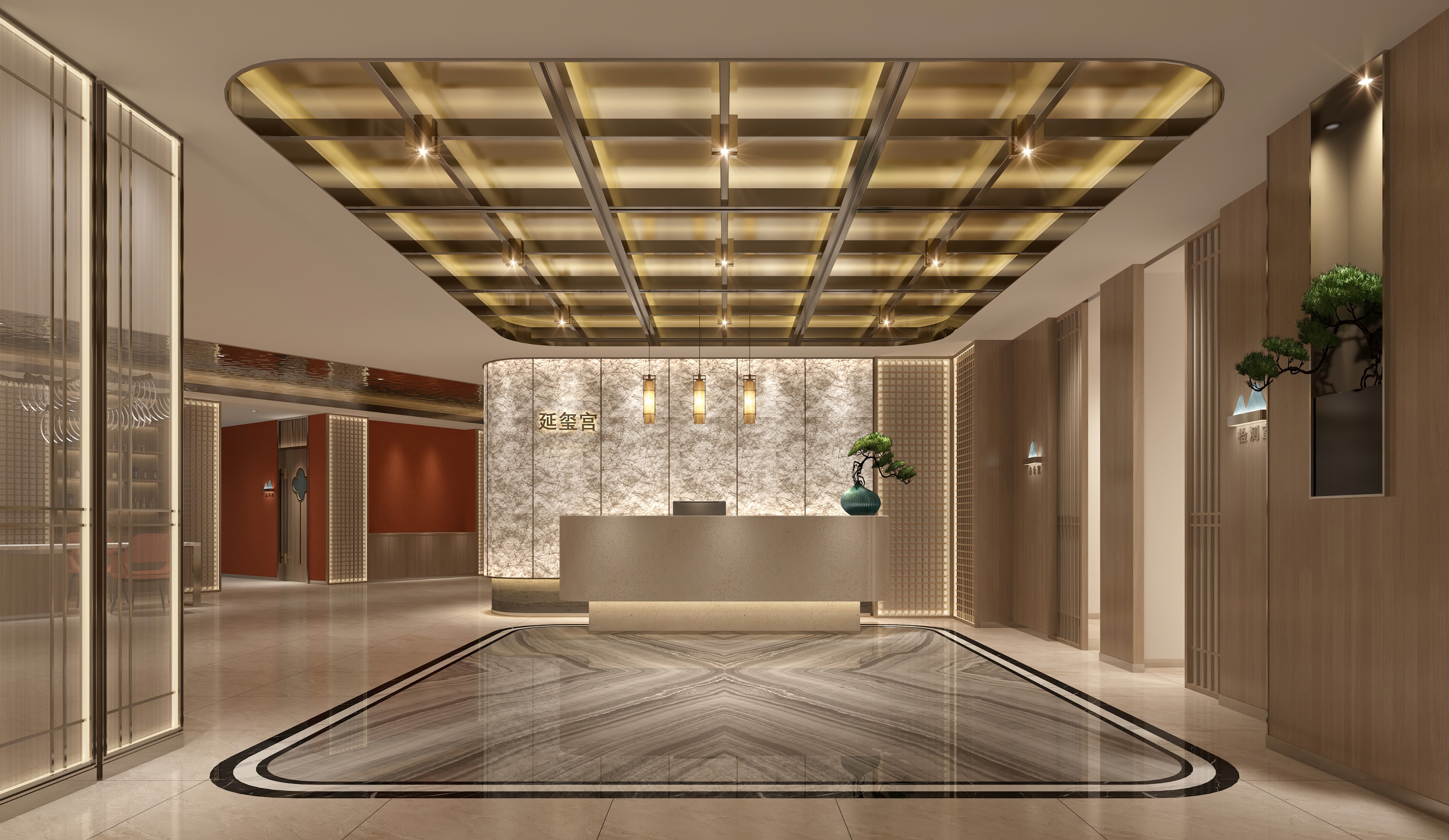 整體設計上,設計師沒有采用過于金碧輝煌的奢華設計,轉而運用大面積原木建材,配合中式建筑中的格柵、藻井、宮燈等經典設計元素,打造輕奢淡雅之感,更為契合當下消費者喜好。同時為避免因為原木建材和暖黃燈光帶來的整體設計過于單薄乏味,設計師在不破壞整體設計觀感的前提下,在前廳地磚選擇上采用了擁有明顯黑色界線和充滿水光波紋的大理石地磚,以此為整體素雅的氛圍增添了幾分色彩與活力。不僅于此,設計師還在前廳區域的不同位置放置了迎客松,利用迎客松遒勁延展的特性,以立體跳脫打破平面束縛。