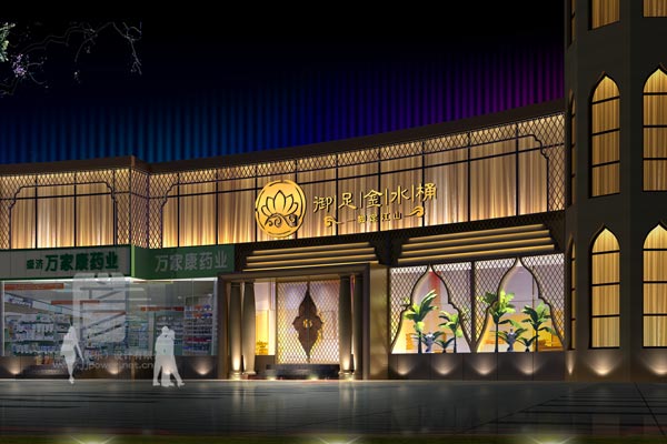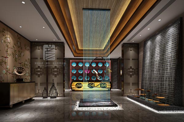 LED與亞克力相結合的新科技方式形成雨簾,中間橢圓形嵌入佛手。左方擺設留聲機,右側打造水景,中間接待臺由黃色透光石打造,后方采用藍色陶瓷盤,其中用一個桃紅色盤點綴。整體簡約與泰式相結合,靈動且精致。