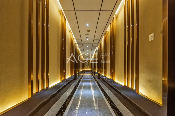 過道的設計簡潔明快,地面大面積采用冷色調云的朵灰作為基礎色,過道兩邊的墻面則采用鏡面不銹鋼,通過反射原理,從視覺上擴寬的過道的寬度,使客人感覺格外寬敞。上半部分墻面則通過香檳金色調不銹鋼線條和燈光的設計,拉高客人的視覺感,使層高毫無優勢的過道也顯得高挑迷人,精致典雅。